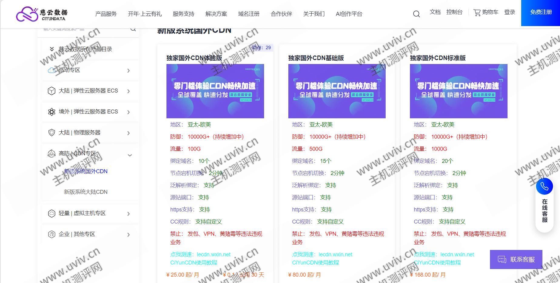 慈云安全CDN商家,主打高防御、低延迟、海量节点,提供高强度的抗DDoS攻击的能力,并且速度和延迟不被影响。海量节点,近源分配,最优的访客体验;轻松搞定流量清洗、防数据泄露,可以高效防御DDos、CC(ChallengeCollapsar)攻击。高速高防国外CDN,独家URL级CC防御规则,支持CC防御策略定制,有0元/月站长扶持套餐。