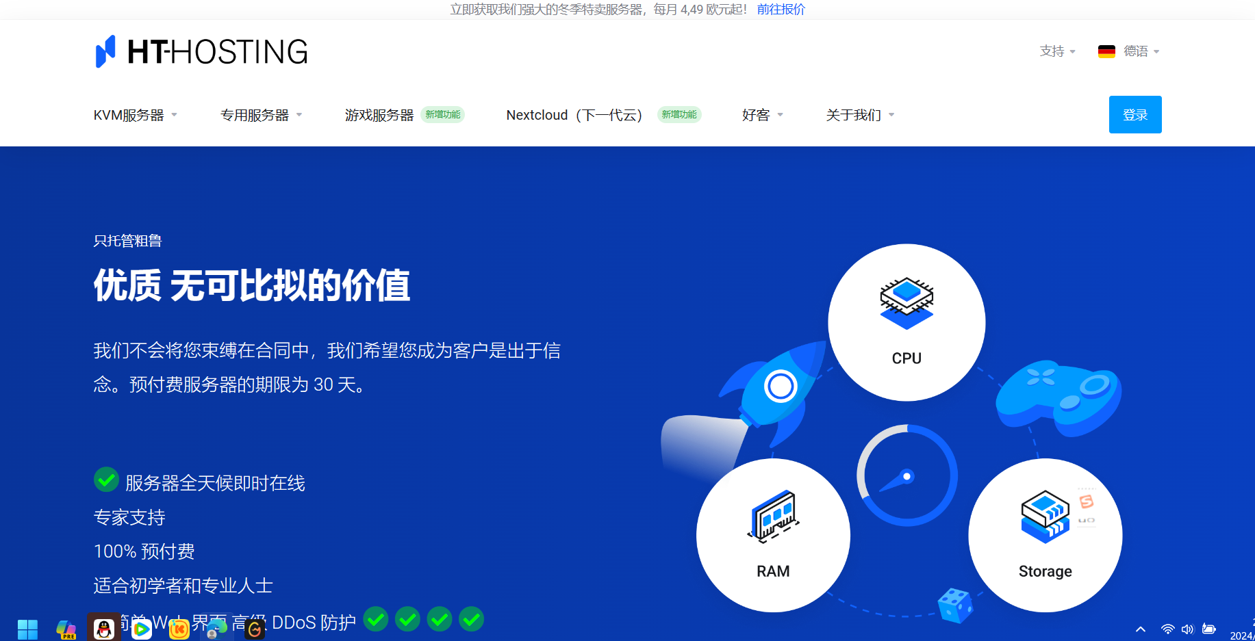 HT-Hosting商家2023年冬季特卖活动现在还在继续,有多款便宜德国VPS非常具有性价比,机房位于德国法兰克福,采用AMD EPYC 7543或AMD EPYC 7402P CPU,DDR4内存,NVME存储,2Gbps共享带宽月流量5TB起步,最低配置4核16GB内存125GB NVME,月付仅€4.49起,无需优惠码直购即可,支持免费安装Windows Server 2022 评估版本,提供免费DDOS保护,支持支付宝、Paypal等付款方式,有需要德国VPS的朋友可以关注一下。