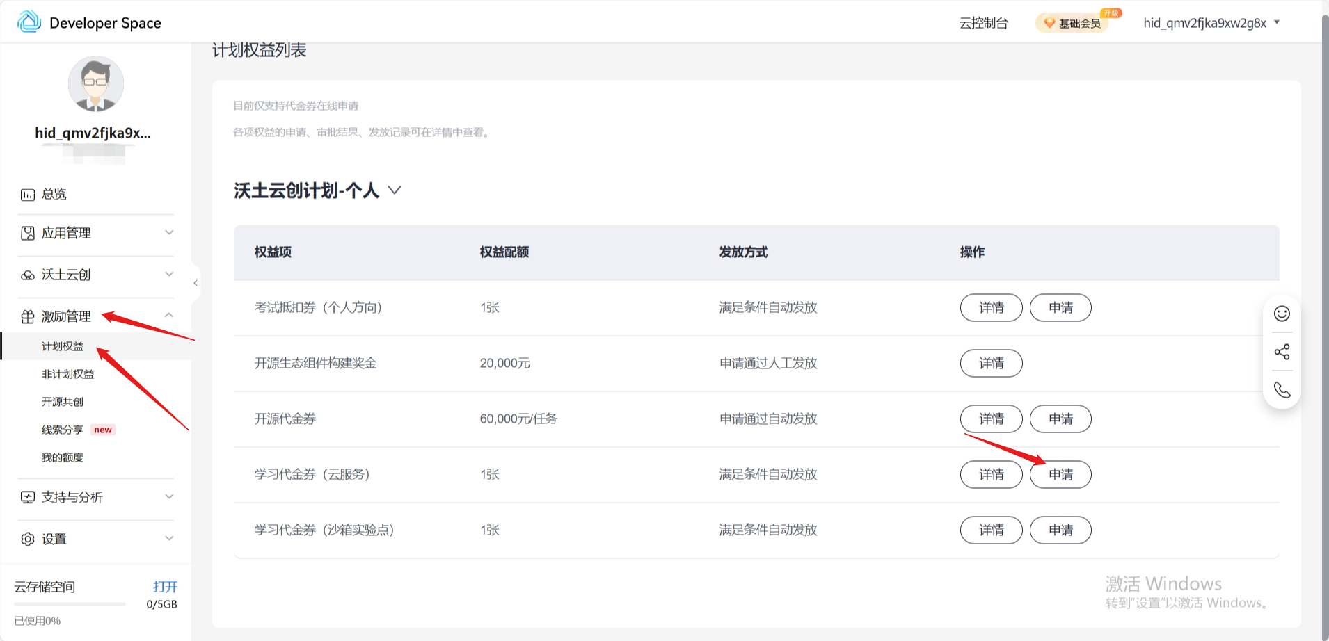 7.在激励管理-计划权益中,领取优惠券,然后教程就结束了,下面教你怎么搞13个月服务器