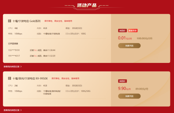 | 宁波 | 2核 | 4GB | 30GB(SSD) | 10Mbps | 电信 | 100G | 9.90元/月 | 链接 |