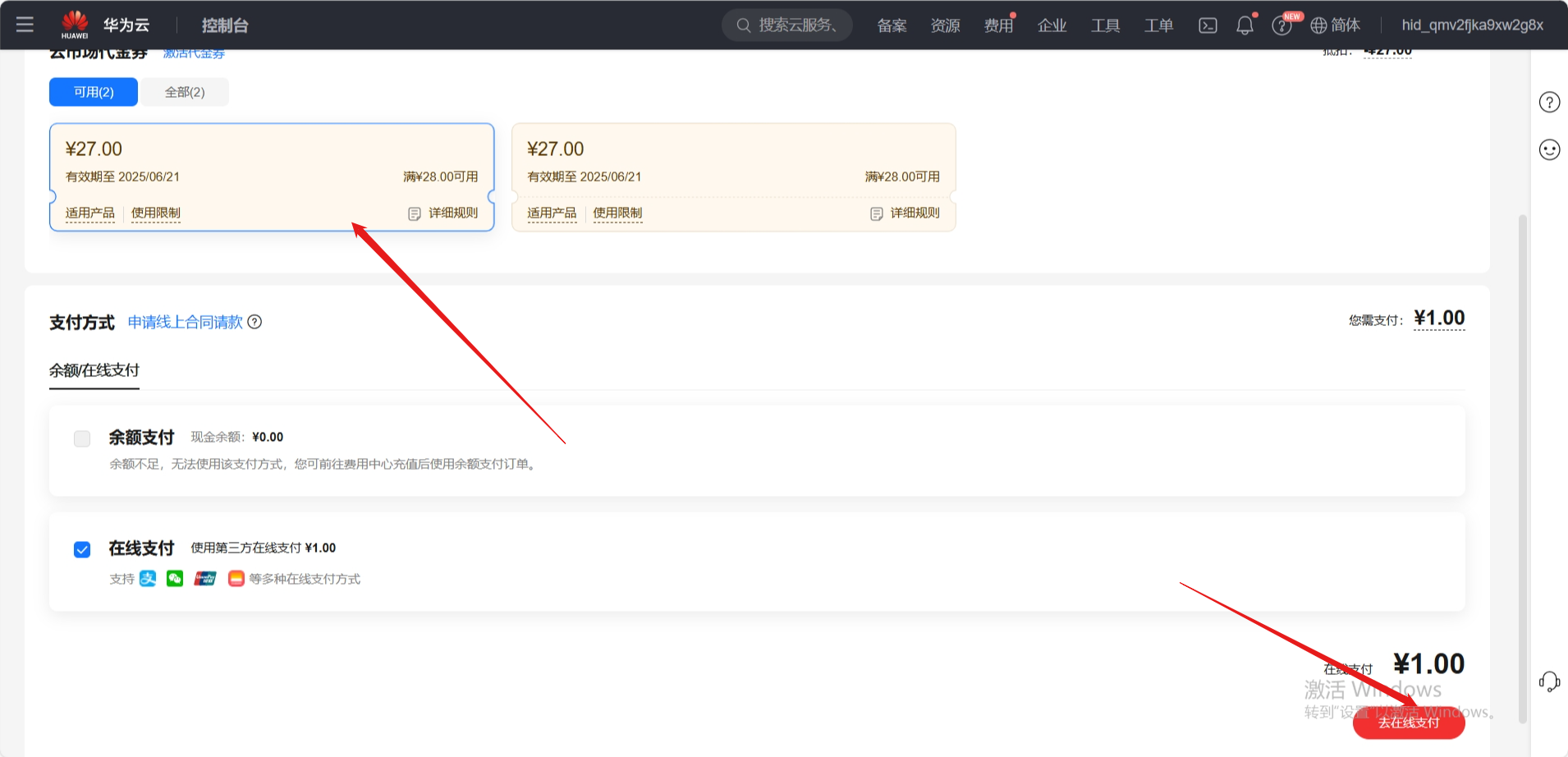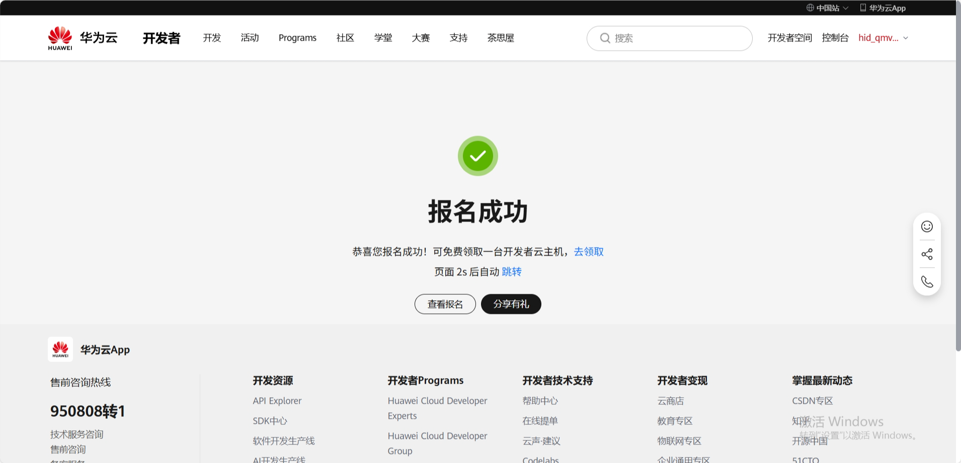 如领取失败,点击页面右上角“账号中心”—华为云业务信息———绑定邮箱,再