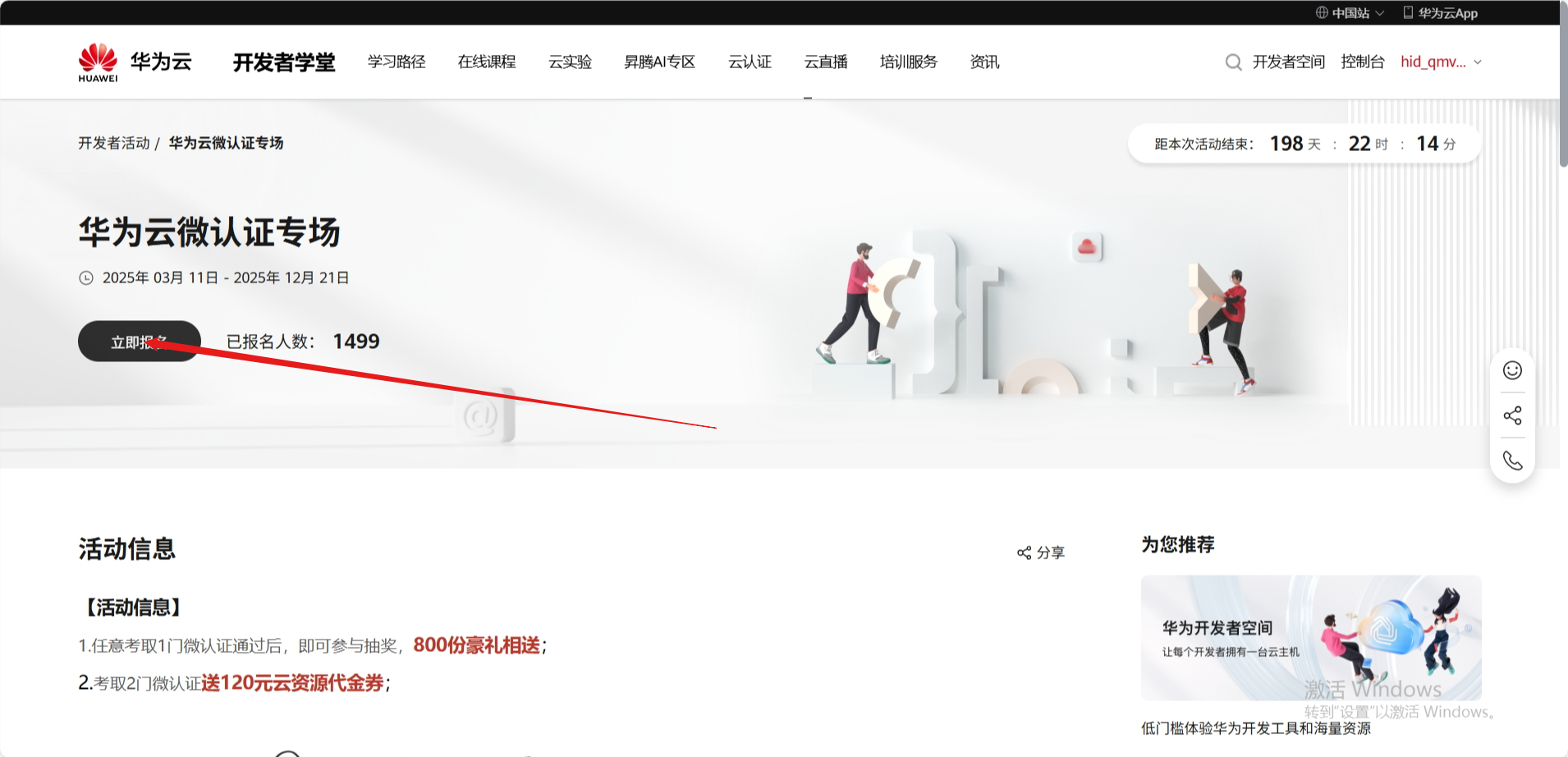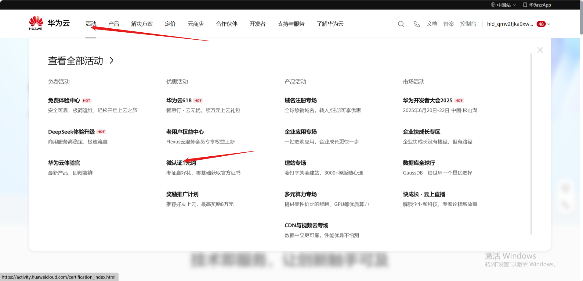 登录华为云账户→点击页面右上角账户名”我的学堂”一我的认证,里面可以查