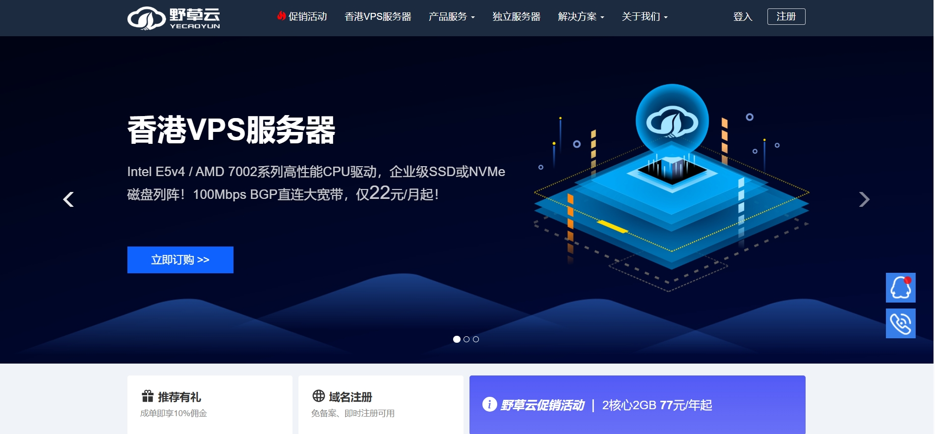 野草云:yecaoyun,2012年成立的国内主机商,Lucida Cloud Limited(HK)旗下站点,提供虚拟主机、VPS和独立服务器租用等产品,数据中心在中国香港和美国洛杉矶。以香港VPS为例,商家促销套餐最低77元/年起,支持使用支付宝、PayPal等付款方式,可选Intel或者AMD CPU系列,可选国际、优质或者精品带宽,中国大陆优化直连,香港独立服务器也仅199元/月起,优质/精品网络国内直连。