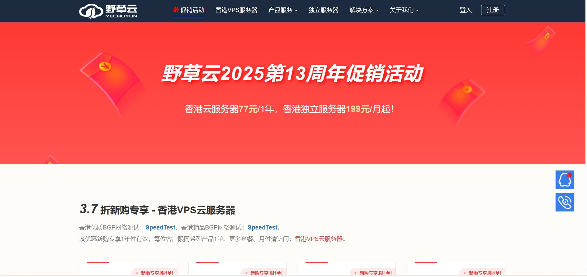 野草云:yecaoyun,2012年成立的国内主机商,Lucida Cloud Limited(HK)旗下站点,提供虚拟主机、VPS和独立服务器租用等产品,数据中心在中国香港和美国洛杉矶。以香港VPS为例,商家促销套餐最低77元/年起,支持使用支付宝、PayPal等付款方式,可选Intel或者AMD CPU系列,可选国际、优质或者精品带宽,中国大陆优化直连,香港独立服务器也仅199元/月起,优质/精品网络国内直连。