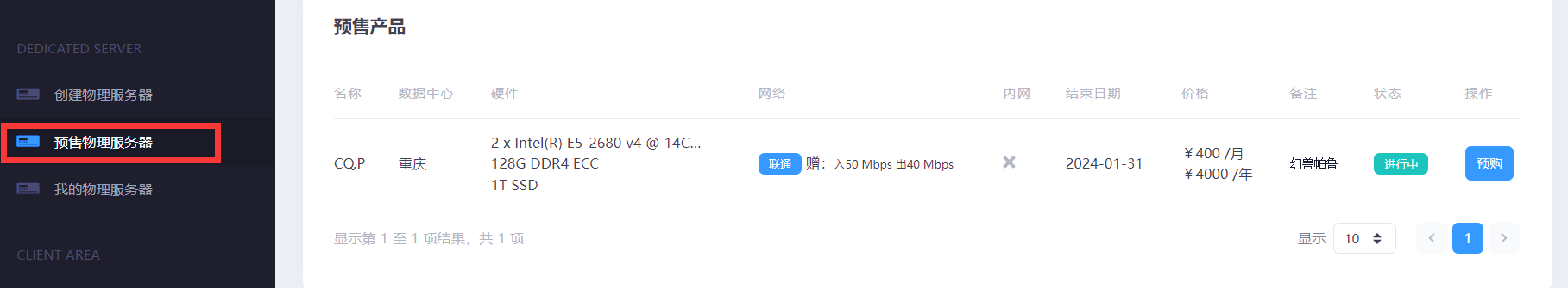dogyun当前在预售重庆联通机房的独立服务器,默认自带50M入/40M出带宽(不限流量),2*e5-2680v4、128G DDR4、1T SSD,整个服务器配置算是相当高了,支持linux和Windows操作系统。当前预售价格为400元/月、4000元/年,预售过后恢复600元/月(6000元/年),需要国内高配独立服务器的朋友可以考虑下。