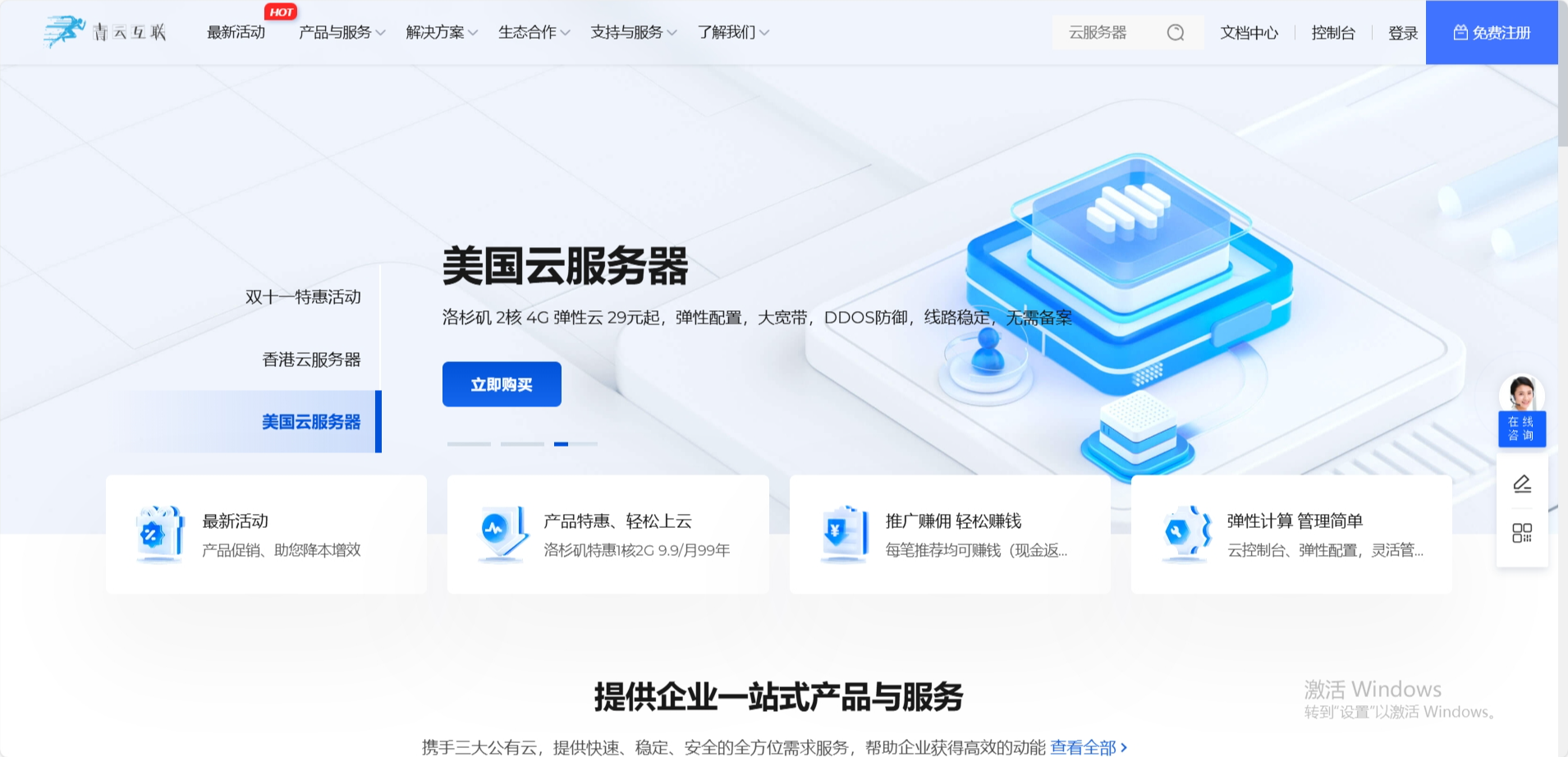青云互联发布了双十一特别促销活动:香港大埔CN2线路、美国洛杉矶精品线路(电信CN2、联通CUII、移动CMIN2)的云服务器低至9.9元/月。云服务器分大带宽限流和小带宽不限流量两种类型,全部采用KVM虚拟架构,纯SSD raid10阵列,从40G硬盘开始提供Windows操作系统。