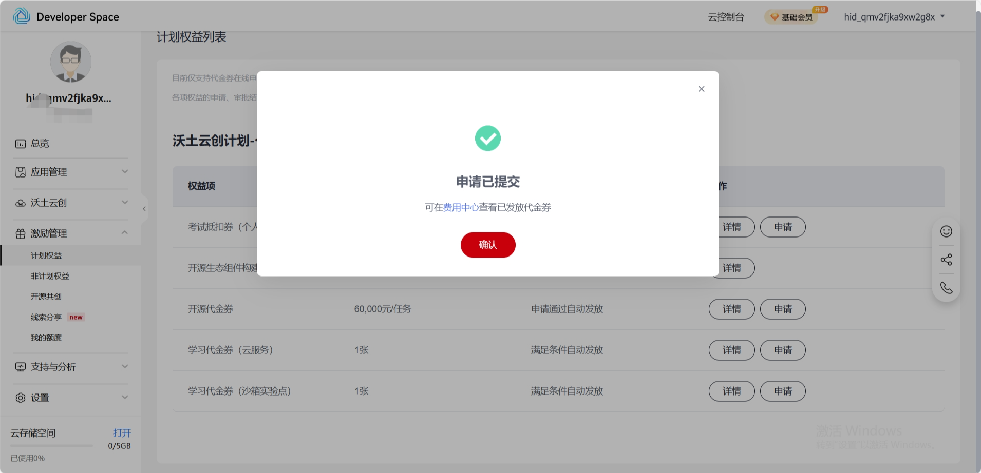7.在激励管理-计划权益中,领取优惠券,然后教程就结束了,下面教你怎么搞13个月服务器