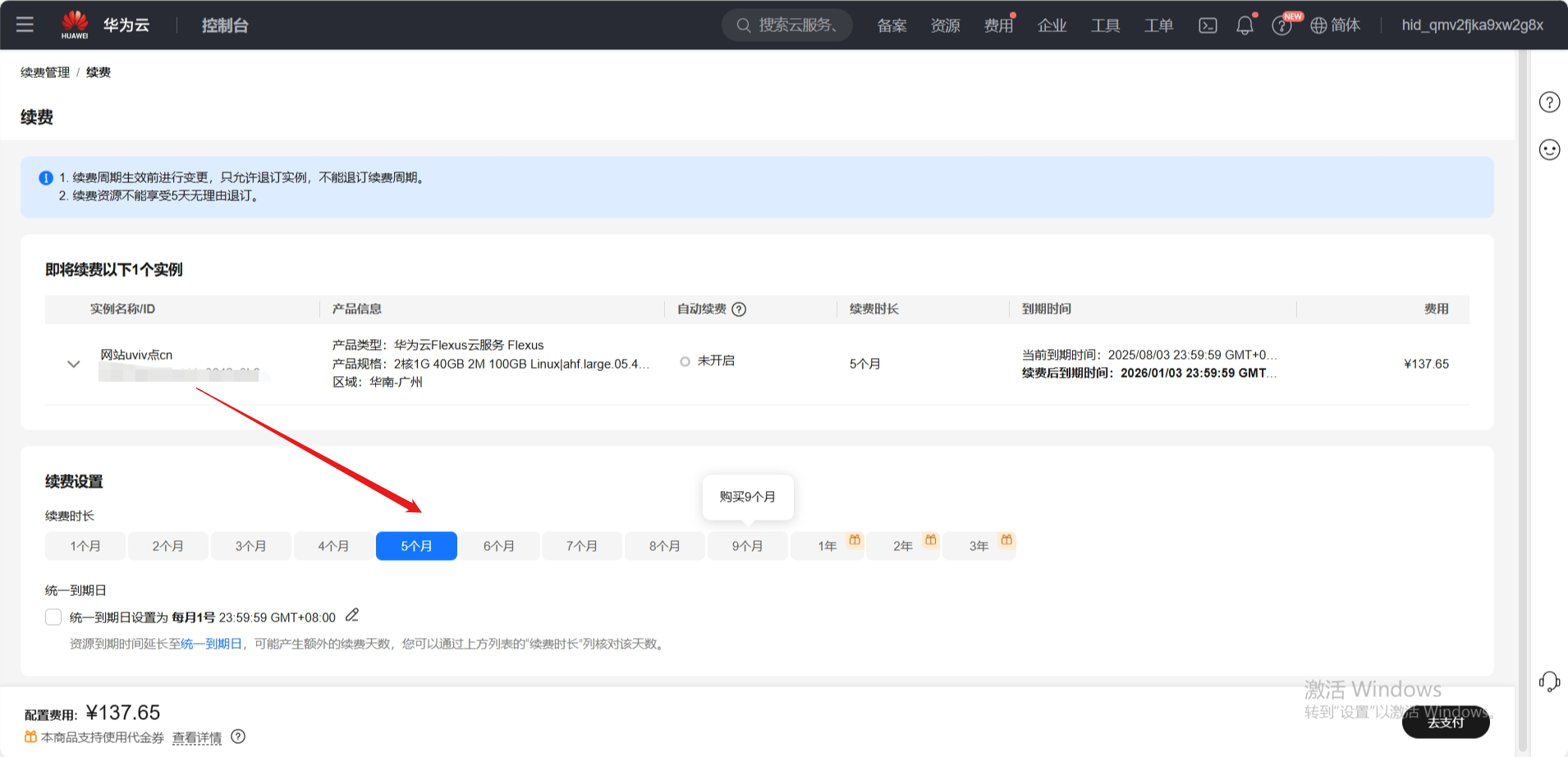购买时不要选择1年,可以先买8个月,再续费5个月。