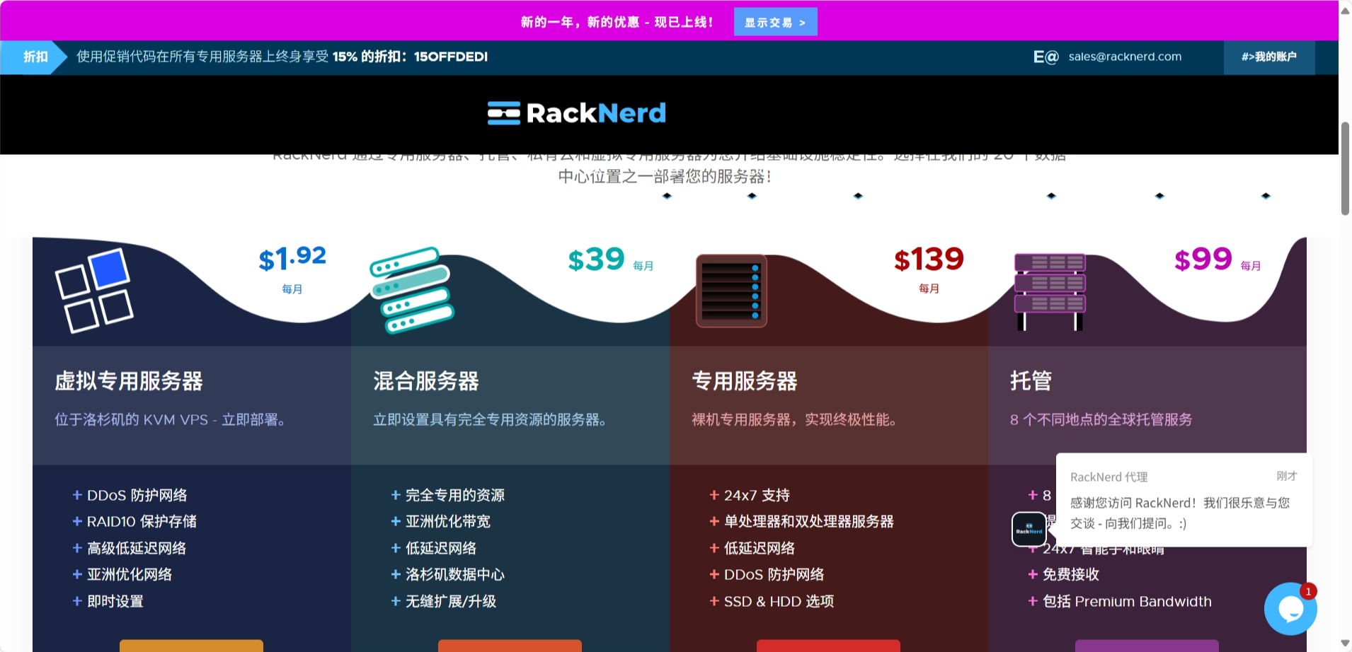 RackNerd商家目前官网在售2024年黑色星期五推出的便宜年付VPS,低至10.99 美元 起,配置为1核1GB内存、20 GB SSD(Raid10)存储,1Gbps带宽月流量1500GB,基于KVM 虚拟, SolusVM 控制面板 ,后台可重新启动、重新安装、管理 rDNS、自助更换IP等,可选芝加哥、纽约、达拉斯、西雅图和圣何塞机房。支持使用支付宝、PayPal、信用卡等付款方式。