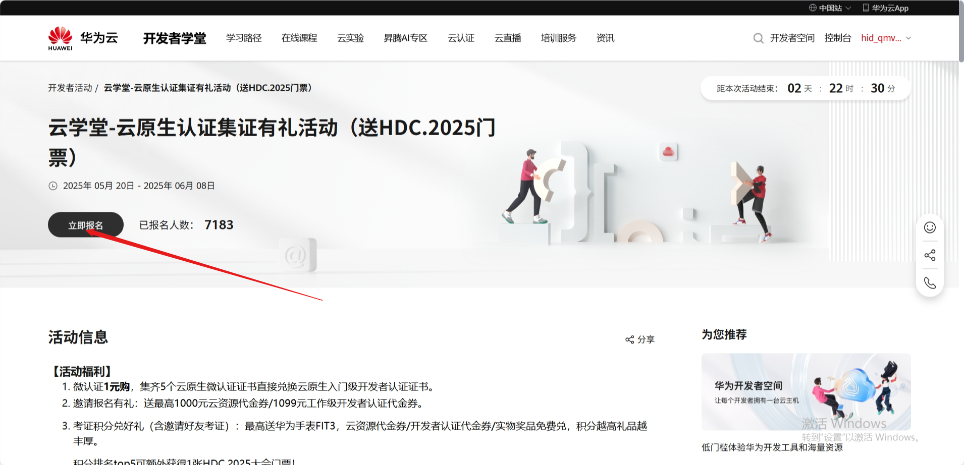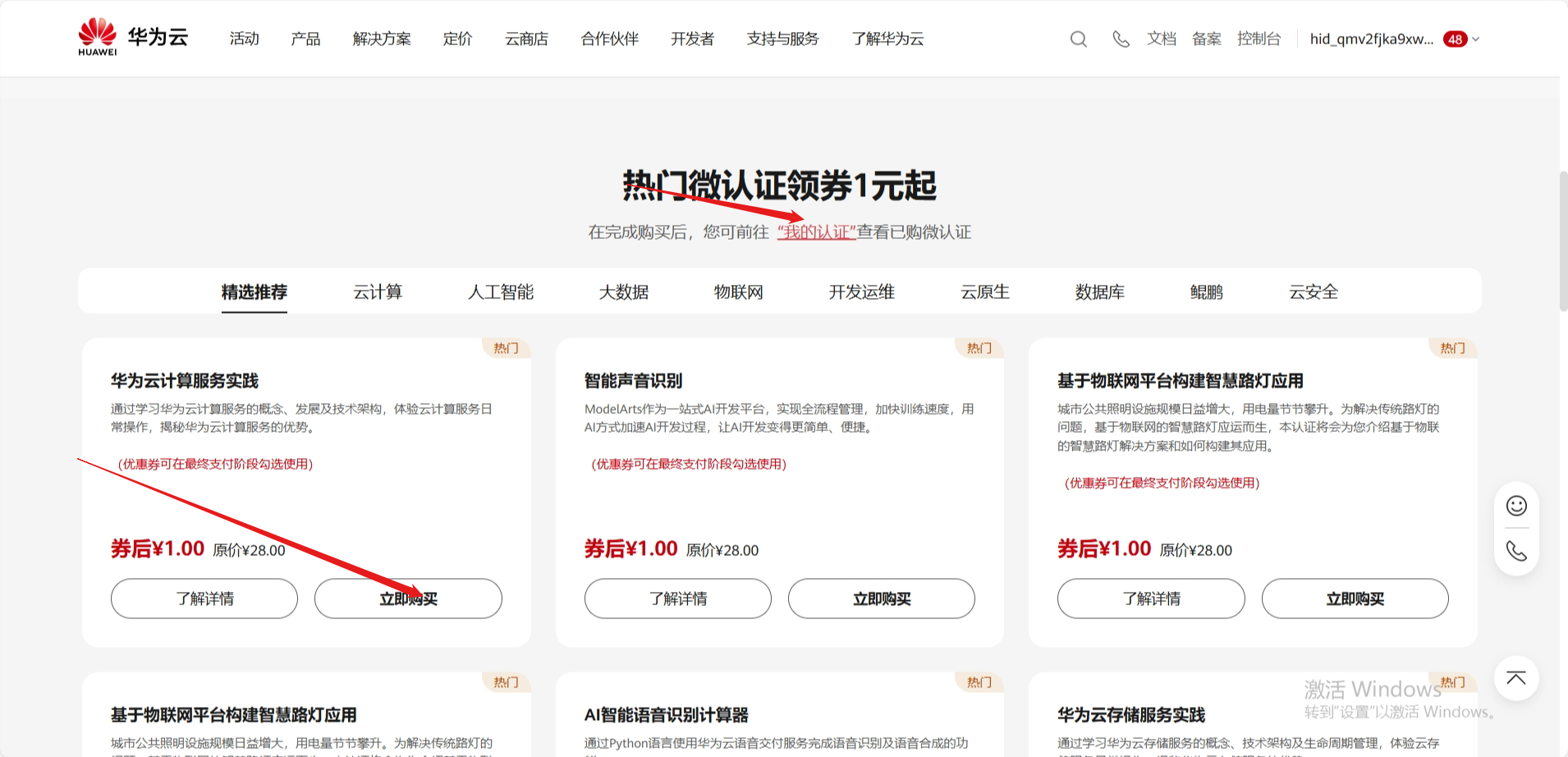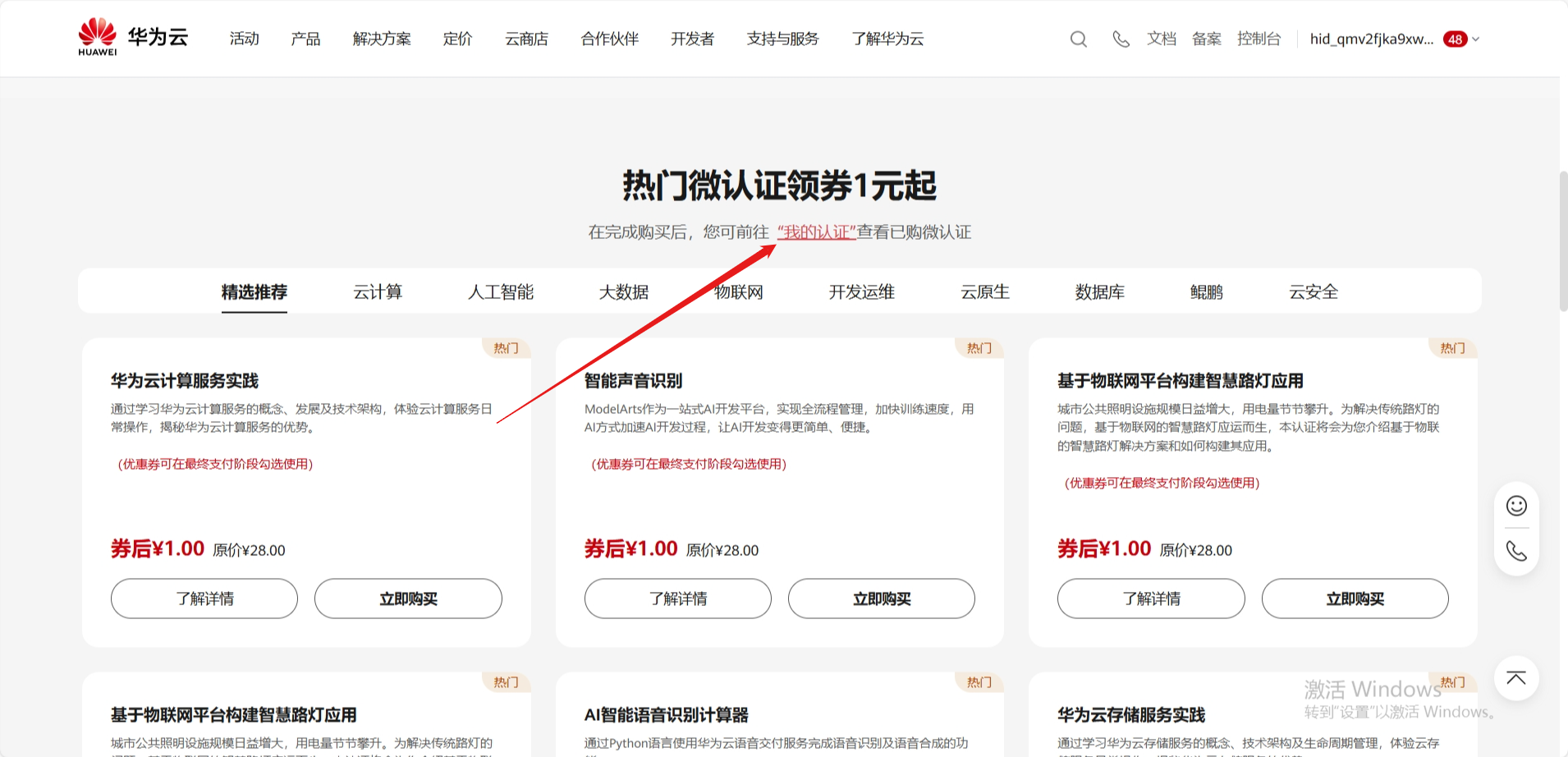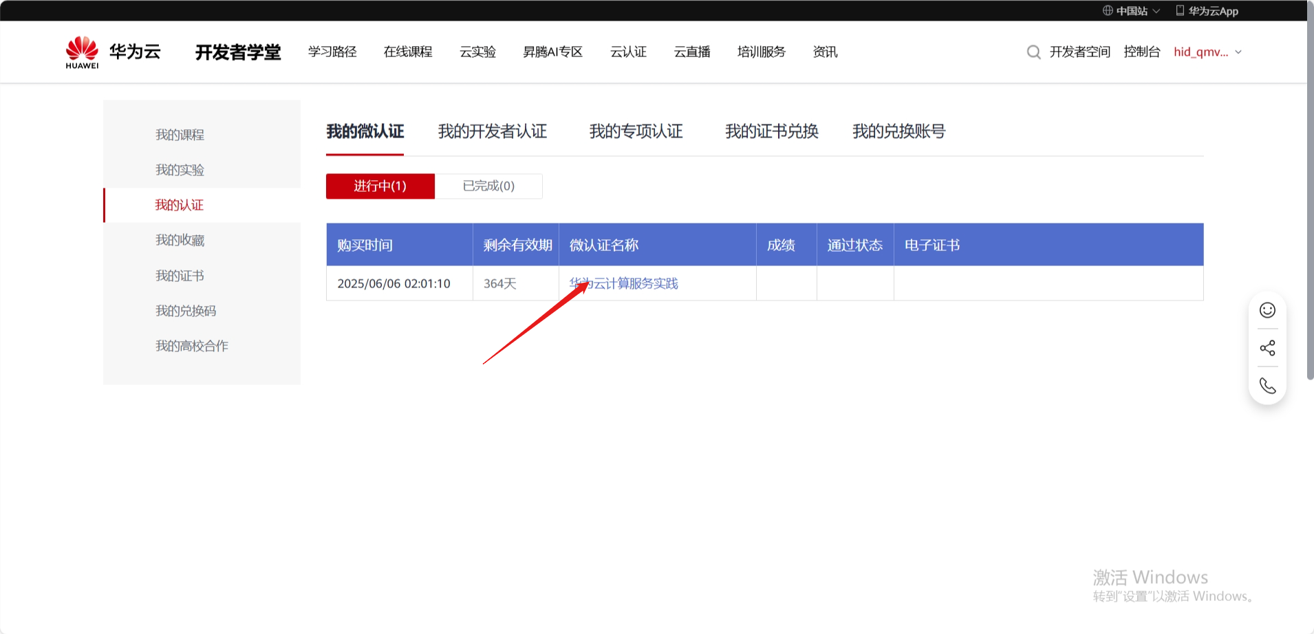 登录华为云账户→点击页面右上角账户名”我的学堂”一我的认证,里面可以查